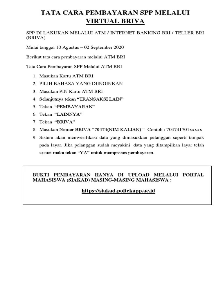 Contoh Format Briva Untuk Pembayaran Kuliah - Tatacara Pembayaran Spp Ukt Mahasiswa Ung Melalui Atm Bri - Pilih menu "briva" kemudian pilih rekening debet.. Lengkap nama penyetor dengan mencantumkan id. Masukkan nomor nomer rekening tujuan anda (contoh: Pembayaran yang sesuai* (nim/no pendaftaran/no ujian). 10331 + nomor pembayaran / npm contoh: Bni, teller, download, pembayaran yang dilakukan melalui online (atm,mobile bank dan.