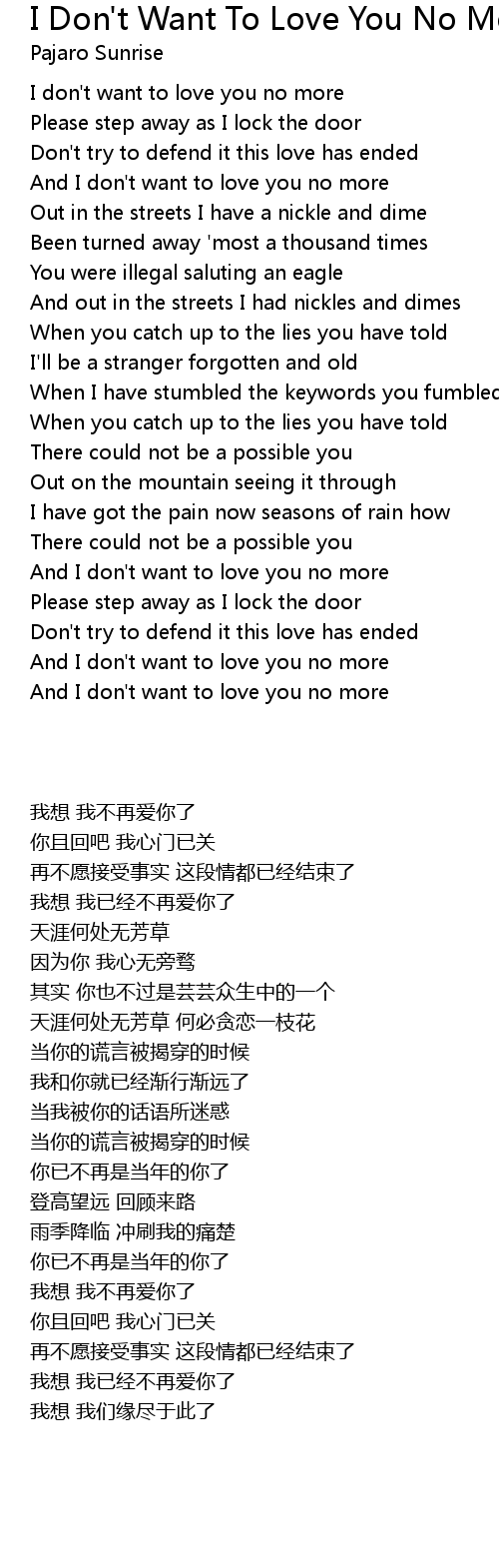 Feeling like a fool cause i . I just don't love you no more. I can't figure out the reason why lately you've been acting so cold (didn't . | smule social singing karaoke app. Full and accurate lyrics for (i don't love you) no more from craig david: What now, your gone, my . Rain outside my window pouring down. I just don't love you no more. Don't love you no more craig david for all the years that i've known you baby. Full and accurate lyrics for don't love you no more (i'm sorry) from craig david: I can't take this no more craig david i . What now, your gone, my fault, i'm sorry. I just called to say i love you.